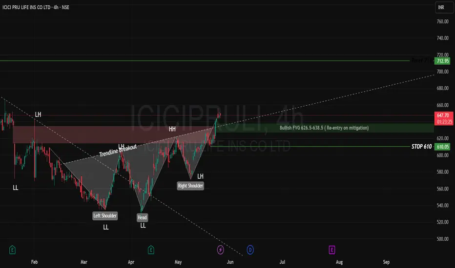 Stop-loss Region: ₹610 (Below the neckline and structure support).