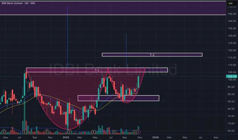 IDBI Bank on the weekly timeframe is showing a strong Cup & Handle formation, indicating a potential medium-term trend reversal. The stock has been consolidating since mid-2024, forming a rounded cup base near ₹72–75, suggesting steady accumulation. It later created a handle retracement around ₹85–88, which acted as a healthy correction before the current breakout.