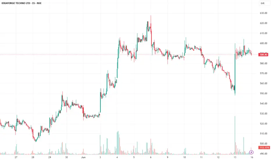 IDEAFORGE recently showed a sharp recovery after a strong downtrend, rebounding from ₹552 to ₹590+ in one session on heavy volume. This V-shaped recovery signals potential short covering or accumulation.