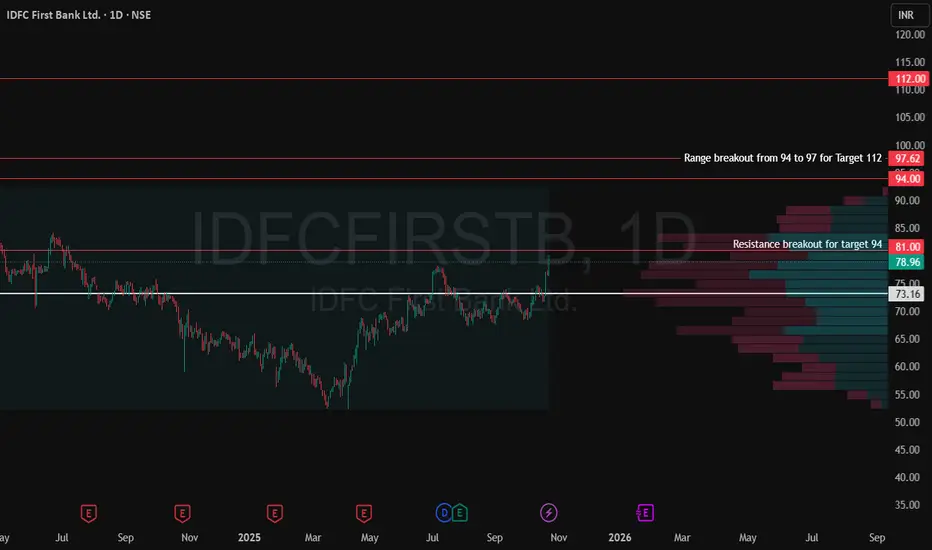 IDFC First Bank is in a solid uptrend with fundamental strength, but price is close to short-term analyst targets. Hold for long term, Buy on dips, book profits near ₹80–90-112 if trader, but don’t exit completely as future upside is possible if recent growth momentum sustains.