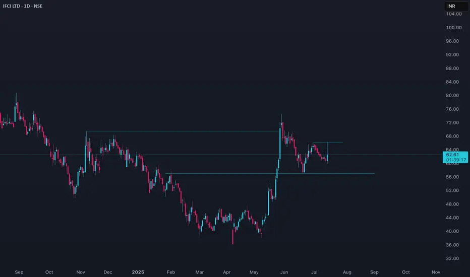 IFCI has shown significant volatility in recent months. After a strong rally earlier in the year, the stock has entered a corrective phase, with the price currently hovering around ₹60.58–₹64.50 as of July 14, 2025. The broader trend over the past year has been negative, but the last quarter displayed a sharp upward move, followed by some consolidation and profit booking.