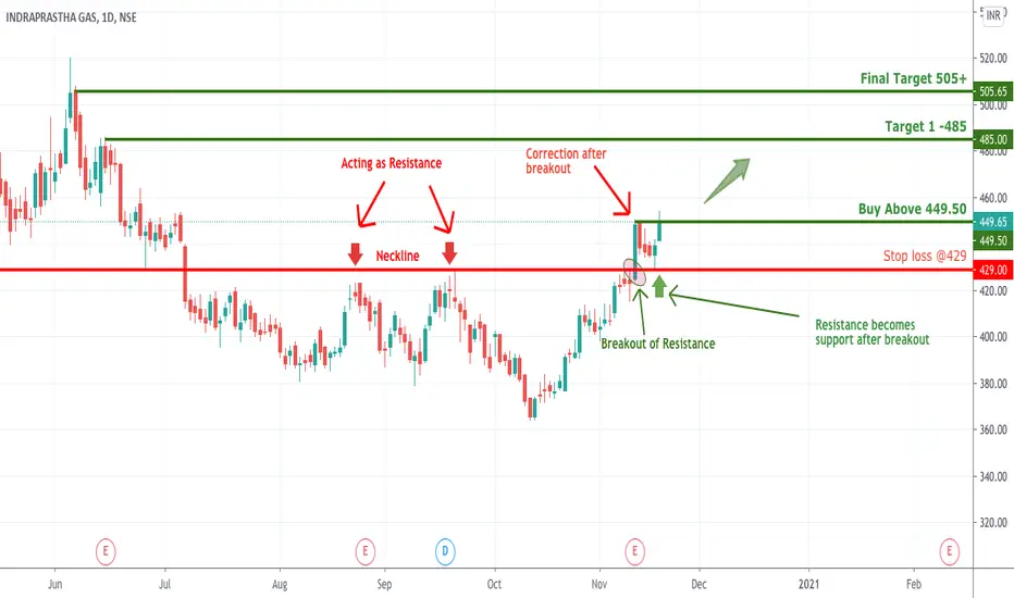 After the breakout of the neckline at 429, its completed correction move and again ready to move towards its immediate target at 485. We can get good risk-reward in this trade. Downside 429 is acting as support so we can set this as a stop loss for this position.