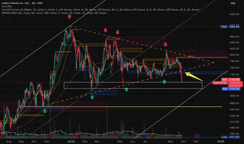 The chart has formed a symmetrical triangle pattern, which has taken shape over approximately 270 days. This pattern was recently broken, and a new support level has emerged around 713.
