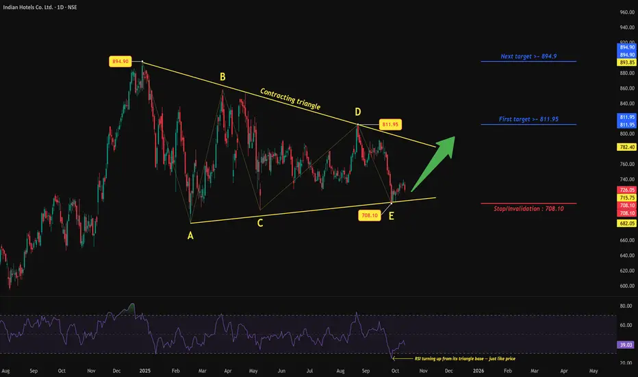 Price action has been coiling within a clean contracting triangle, with the recent rebound from ₹708.10 likely marking the E-wave low. The broader structure fits neatly as a possible Wave (4) consolidation within the larger uptrend.