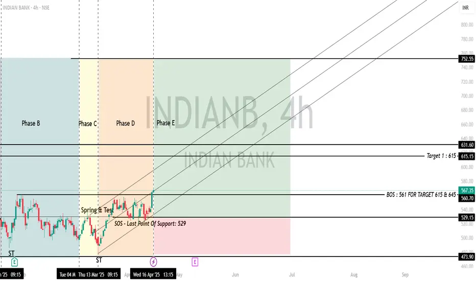 Bullish Trade Idea: Buy above 561, target 615 with stop below 529, confirming upward momentum from Spring & Test phase.