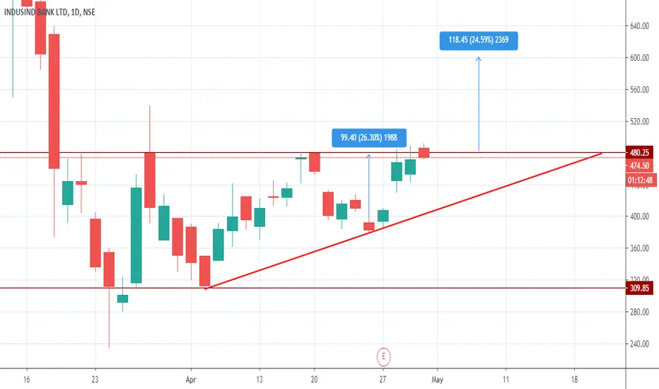 INDUSIND tried to break 480 levels, as long as it sustains above the support trend line, it will try to retest the resistance levels. if it is able to close above 480 levlels. it can rally upto 600 levels.