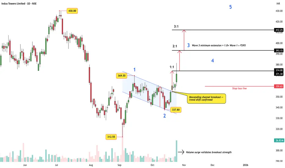 After a steady five-wave advance from ₹312.55 to ₹369.55, Indus Towers entered a clean descending channel, forming the corrective Wave 2.