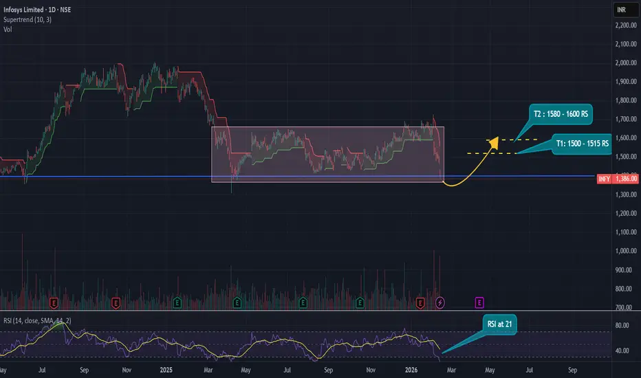 Infosys has been consolidating within the ₹1400–₹1700 range over the past year. Currently, the stock is in the oversold zone, with the RSI at 21, and is testing a strong support level around ₹1400.