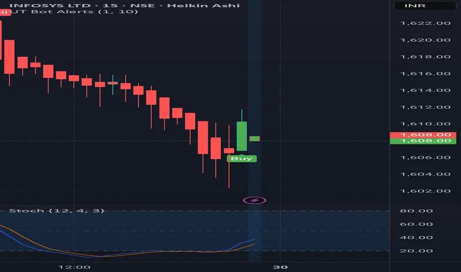 2 signal compare stochastic and ut bot alert, without changing the settings only stochastic changes to be made to 12,4,3, it should be helpful to decide the stock tou trade after using a reliable scanner you can also use it on different time frames