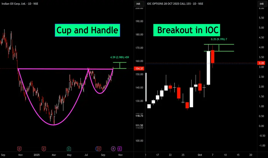 dian Oil Corporation (IOC) is exhibiting a classic cup and handle pattern on the daily chart, signaling bullish momentum. Recently, a breakout was observed, supported by strong volume, with a potential upside of nearly 3%. Options activity also confirms bullish sentiment. This setup offers a compelling risk-reward opportunity for traders.