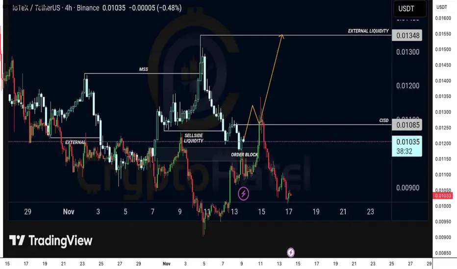Price has already swept sell side liquidity and tapped directly into a fresh bullish Order Block. A decisive candle close above the CISD level at 0.01085 signals strong bullish intent and opens the path toward external liquidity sitting at 0.01348.