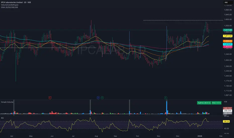 IPCALAB Price is trading above the 20/50/100 EMAs, indicating improving short-term momentum after a prolonged consolidation. Volume expansion suggests accumulation, while RSI remains above 50 without being overbought, leaving room for upside. A sustained move above the range resistance could trigger a fast momentum move, while the EMA zone acts as immediate support.