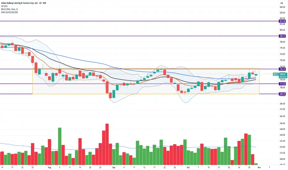 IRCTC has been trading in a tight range between 698 to 736 levels for the past three months.