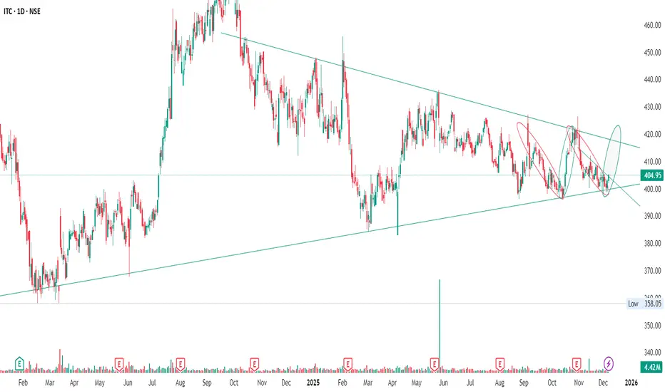 The current swing (green curve) shows a fresh rejection from the same rising support, with buyers once again stepping in near ₹400.