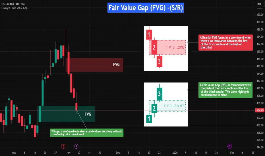 1️⃣ Resistance FVG -- A strong impulsive move causes the low of the first candle and the high of the third candle (in a three-candle sequence) to fail to overlap, leaving a visible gap.