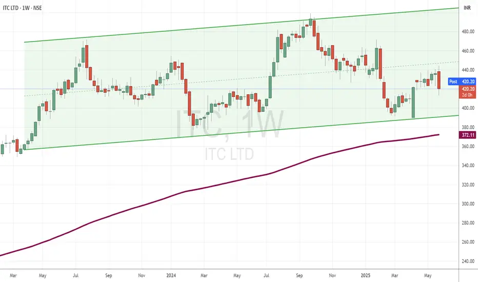 ITC is trading in a range with a slight bullish tilt, presenting structured opportunities within a defined channel.