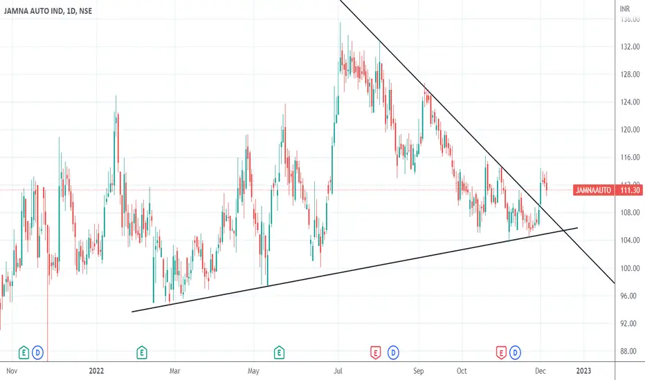 If you draw a trendline from September 2021, it clearly depicts that Jamnaauto now gives triangle breakout. It is sustained above the triangle and retesting is also completed. Now one can make position at 110-111, for the target of 120,125 Stoploss =105