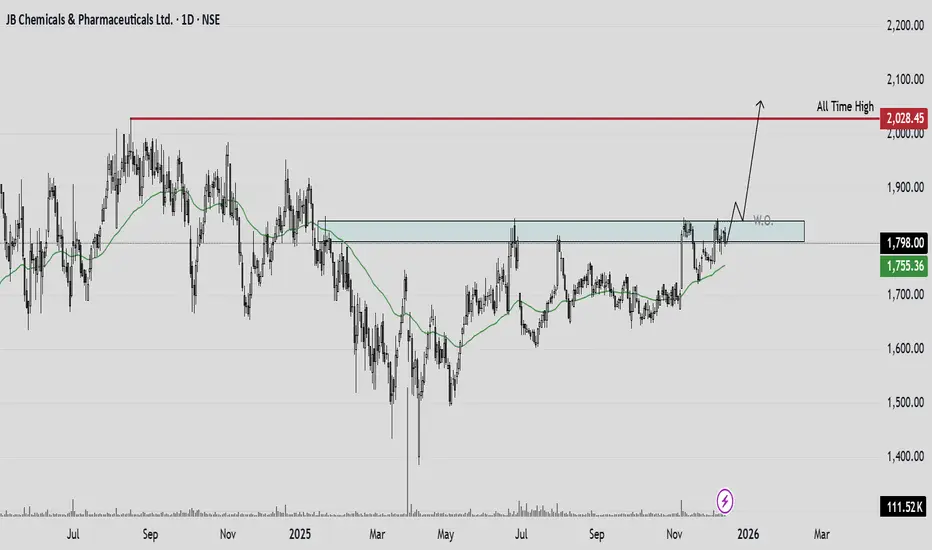 JBCHEPHARM looks ready for an upside continuation move after a healthy consolidation. Price is still holding above key moving averages on the daily chart, indicating that the broader uptrend remains intact despite the recent correction from the 2024 highs. If price breaks above 1850 levels, a strong move can be expected towards All Time Highs.