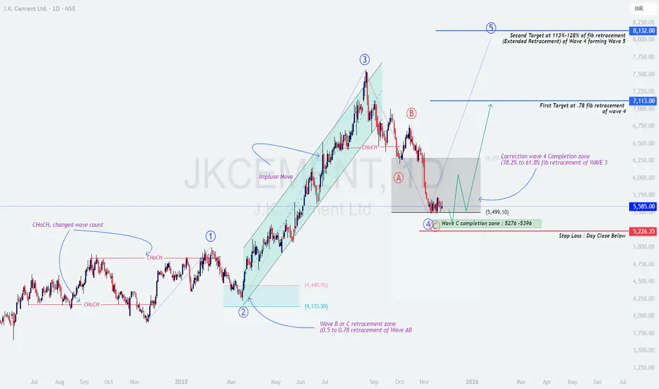 JK Cement is showing a textbook Elliott Wave progression, and price has now entered the crucial Wave 4 → Wave C completion zone (₹5276–₹5396).