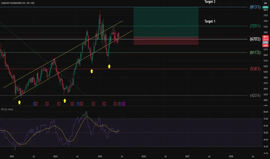 Here's a comprehensive technical analysis of Jubilant FoodWorks Ltd (NSE: JUBLFOOD) based on weekly chart setup