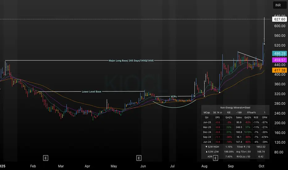 KIOCL breaks out from a 266‑day major long base with a high‑volume expansion after a tight VCP sequence, signaling a potential trend continuation from the lower‑level base to fresh 52‑week highs.