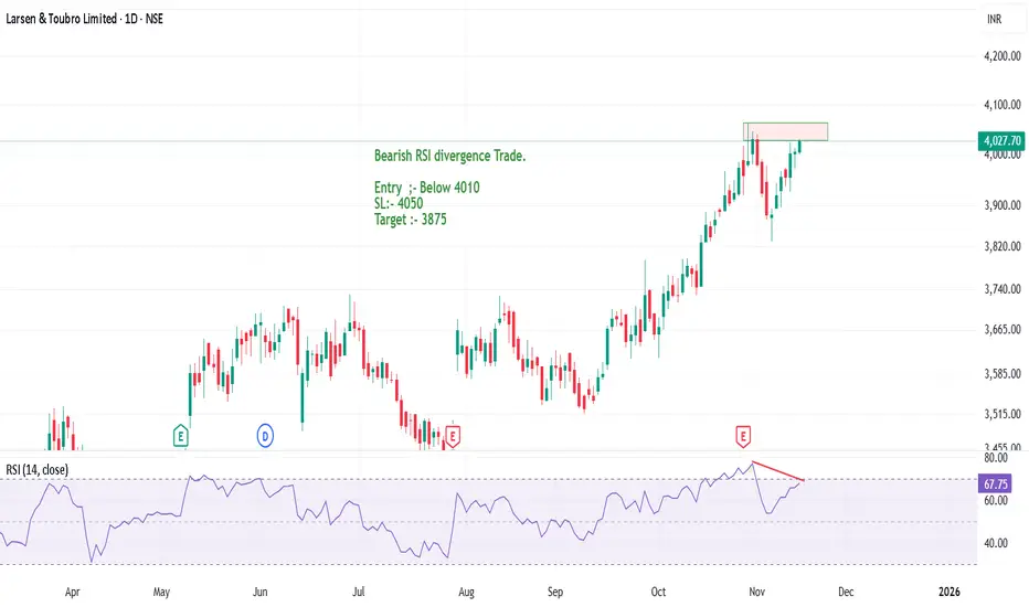 Larsen & Toubro is showing a strong bearish RSI divergence on the daily charts. There can be an opportunity to sell the stock in coming trading sessions.