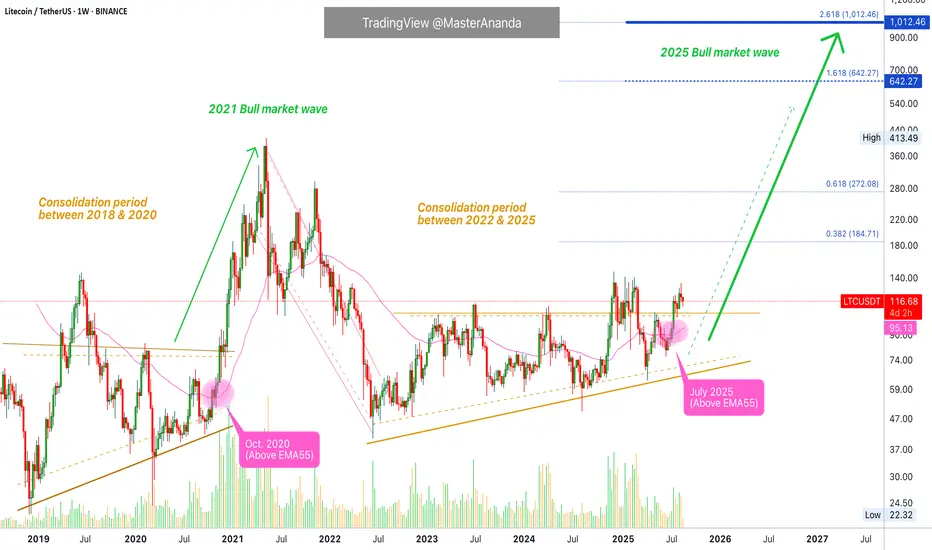 This is a bullish chart. Notice how back in October 2020 Litecoin moved above EMA55, this move launched Litecoin's 2021 bull run phase.