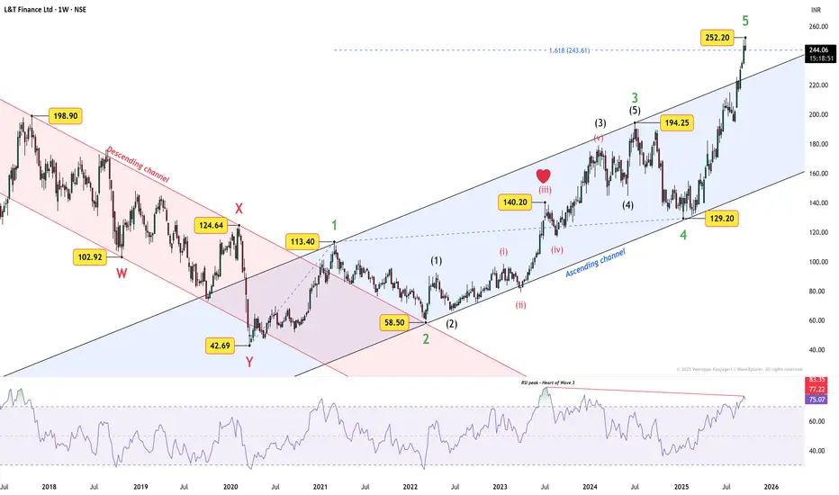 Now, price has surged into Green Wave 5, reaching ₹252.20, which is already above the 1.618 Fibonacci extension. It could extend higher, but RSI is diverging — momentum is not confirming the new highs.