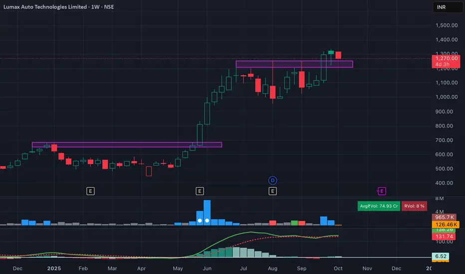 Lumax Auto Technologies has given a clean breakout above the 1,200–1,230 resistance zone and is now retesting the breakout on the weekly chart. Structure remains strong with higher highs and higher lows — showing continuation of the uptrend.