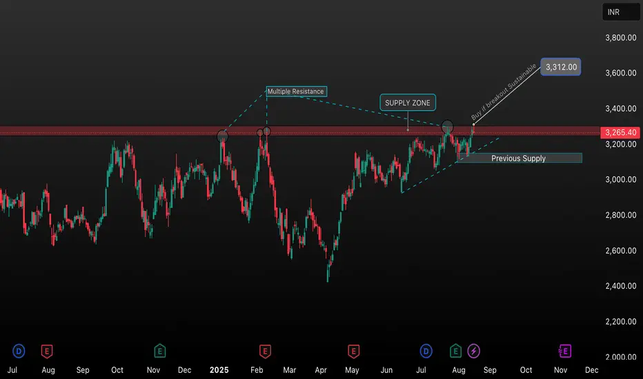 This chart highlights the crucial price action of M&M around the 3,265–3,300 INR supply zone. The region has acted as multiple resistance points in the past, making it a significant barrier for bulls. The current move shows a potential breakout above this supply zone, with a breakout target projected towards 3,312 INR. Traders should watch for a sustained close above this level for possible long opportunities. The previous supply now turns into a potential support level, strengthening the bullish bias if retested successfully.