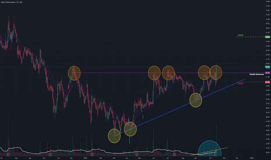 Bank of Maharashtra has delivered a powerful bullish signal today, breaking out of a classic Ascending Triangle pattern on high volume. This decisive move suggests that its consolidation phase is over and a new uptrend is likely beginning.