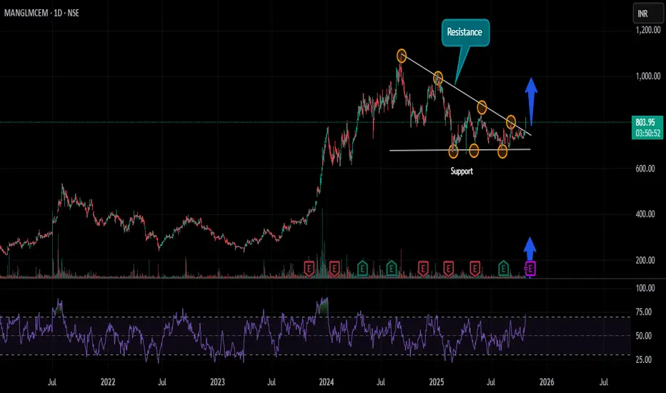 The stock of Mangalam Cement is consolidating from Sept 2024 , taking support at 680 multiple times with decending traingle formation . On 23 Oct , the stock came out of this consolidation with good volume.