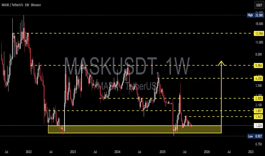 MASK is once again testing the historical support zone at 0.93 – 1.22 USDT (yellow box), an area that has repeatedly acted as a demand zone since 2022. Each time price revisited this region, it sparked strong rebounds.