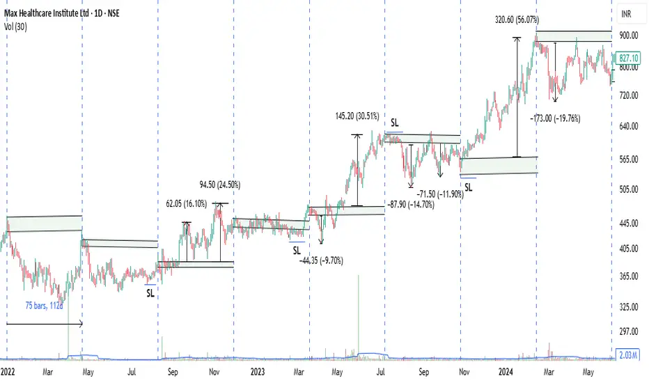 Either a low to high or a high to low otherwise high to high /low to low. Let's take a time cycle of High to high in this chart.And let's see what happens in the future. This is a MAXHEALTH stock chart. we take 31st Dec,2021 High price 458.05/- & last date of this cycle is 21st April, 2022( high price 432/).