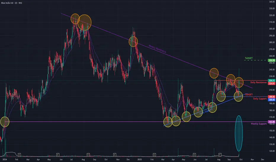 Max India has shown a significant bullish development, decisively breaking out of two key resistance levels today. The stock breached both a long-term angular resistance trendline from July 2024 and a short-term resistance from July 2025. This powerful move was confirmed by a massive surge of +14.95% on the back of exceptionally high trading volume, with the stock closing at ₹224.11.