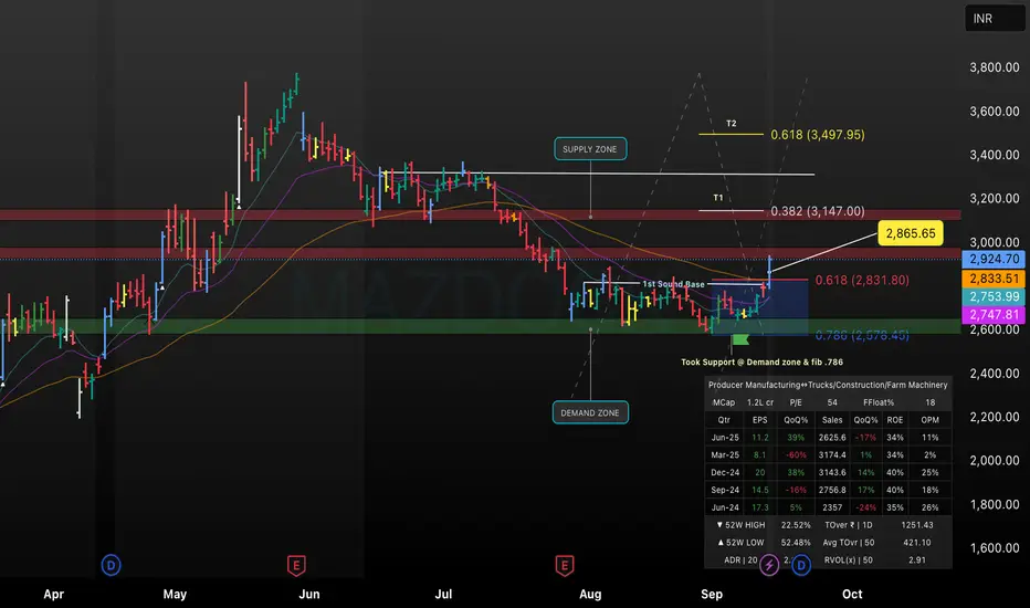 MAZDOC rebounded from the key demand zone and .786 Fibonacci level, confirming support for a bullish move. Price closed above the 0.618 retracement and immediate resistance (₹2,865.65), setting sights on higher targets: T1 (₹3,147.00, 0.382 Fib) and T2 (₹3,497.95, 0.618 Fib). Key supply and demand zones are mapped. Track the retest of breakout levels and volume confirmation for sustained uptrend