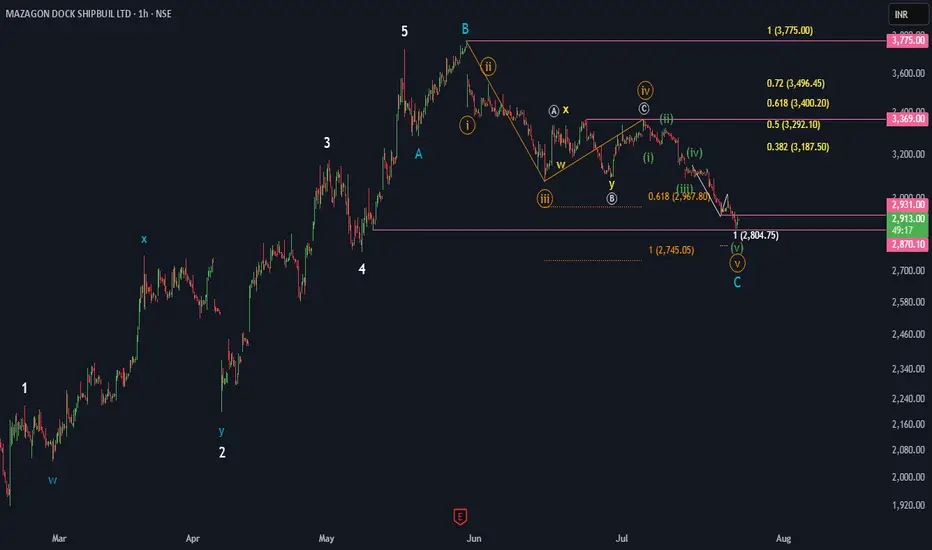 As shown in white color an impulsive 5 wave move got completed at the high of 3775,post which we are seeing an ABC correction marked in BLUE color,this ABC turned out to be an irregular type wherein wave B crossed wave A high,post which we are seeing an impulsive decline marked in mustard color.This wave C impulse's wave 5 is already extended,hence going forward we can we can quick recovery once price crosses 2931 level.