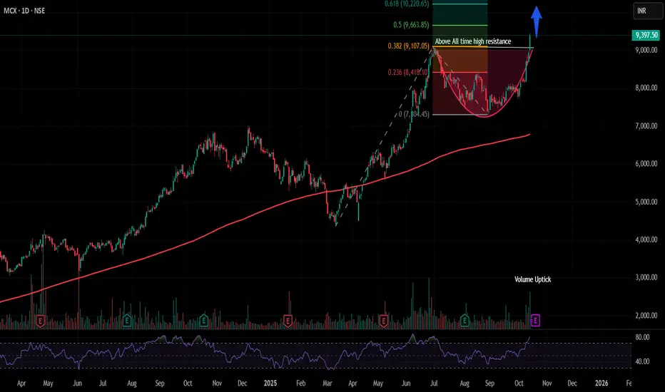 This is the daily chart of the MCX , the stock price yesterday came out of the all time high formed in July this year with good volume.