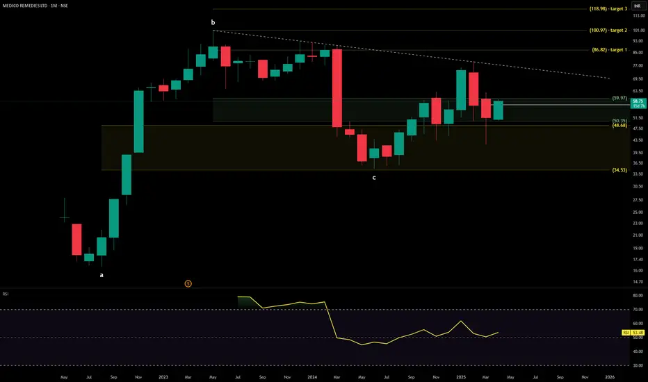 Key Levels: Support levels are identified at 50.23 INR and 34.53 INR, suggesting potential price stabilization at these thresholds. The upside swing zone lies between 59.97 INR and 62.00 INR, indicating an area of possible upward momentum. Key upside levels are noted at 86.82 INR, 100.97 INR, and 118.98 INR, which could act as benchmarks for further price movements.