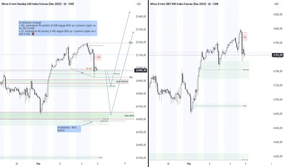• NQ 4H: ostatni wybicie szczytu, powrót do +FVG 24 95–24 90; niżej 24 65–24 60.