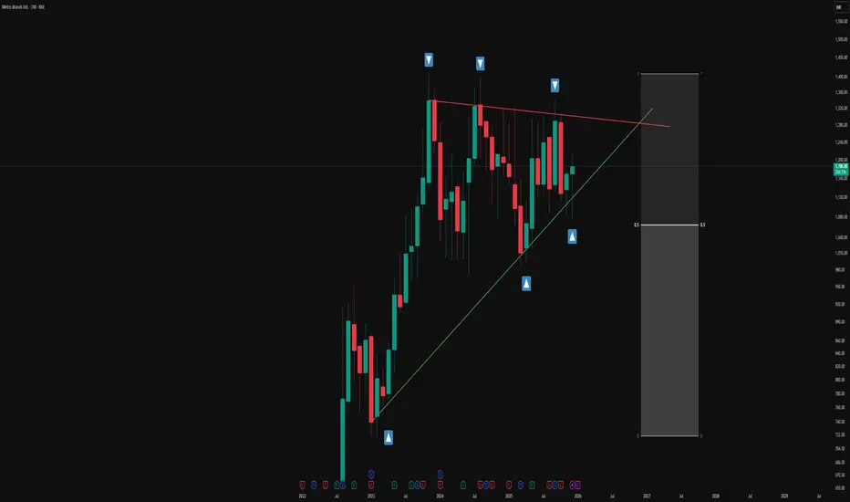 1.The green line represents the primary trendline, drawn from successive higher swing lows where price has repeatedly found support and turned back up. Each time price touches or approaches this green line, the contact is marked with a blue upward arrow box to emphasize how buyers have consistently responded around this rising level. Together, these points of contact visually document the stepping pattern of higher lows that contributes to the lower boundary of the triangle.