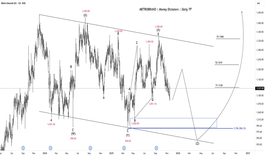 Metrobrand has been trading inside a broad downward-sloping channel for a long time, repeatedly getting rejected from the upper trendline. Each corrective structure appears as part of a complex W-X-Y-X-Z pattern, and currently, the price seems to be completing the final leg (Z). The earlier lows around 990 were tested twice, showing strong support, and now price is recovering from that zone. The recent rise indicates that sellers are losing strength and buyers are slowly stepping in again.