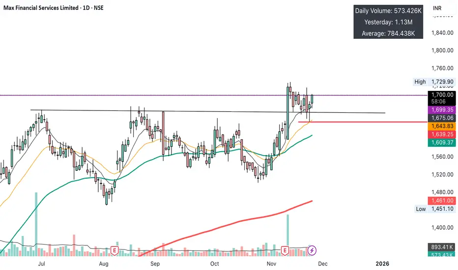 MFSL (Max Financial Services). This is a classic "Tennis Ball" setup: a strong breakout, followed by a controlled pullback to the 21 EMA, and now a confirmed bounce.