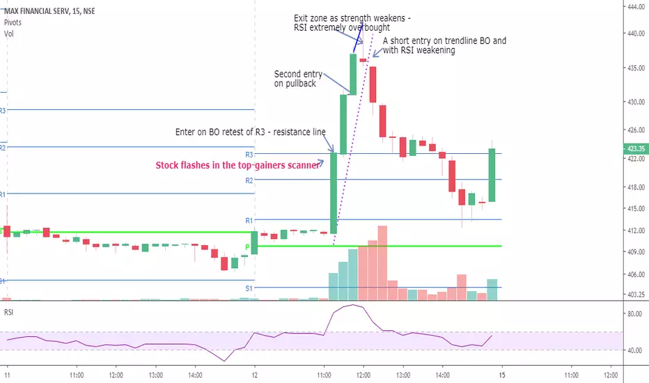 The stock flashed in the top gainer's scanners showing good momentum. The first entry was on the break of R3 pivot with SL tad below R3 line. Second entry could have been on the BO of the first 15 min candle above the R3 or a minor pullback you see here on lower TF - 1 minuter chart.