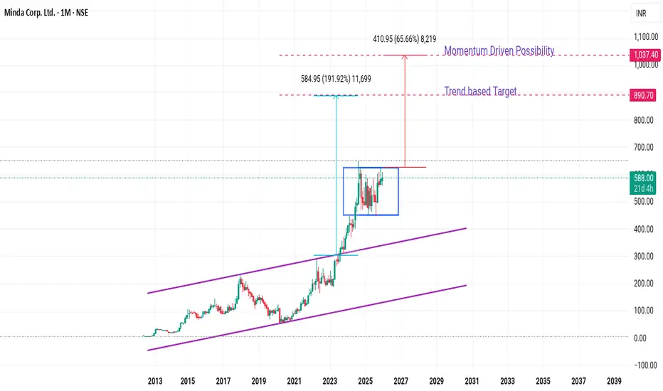 The chart reveals a compelling multi-year growth trajectory. From 2013 to 2023, Minda traded within a well-defined upward channel, building a strong foundation between ₹100-400 levels. The real excitement began in 2023 when the stock broke out of a decade-long accumulation pattern.