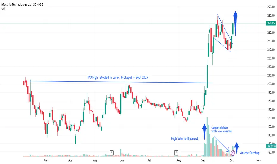 Recent listing ( Feb 2025) of Moschip Technologies broke out from the IPO high price in early September with very good volume. Post breakout the stock moved from 200 to 270 real quick.