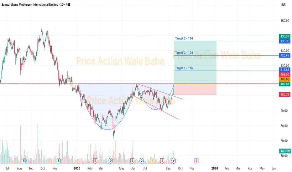 MOTHERSON exhibits a well-defined and technically strong cup-and-handle pattern, confirming a bullish trend continuation signal.