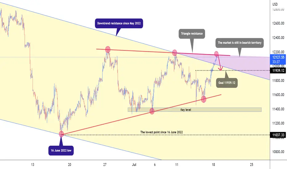 NAS100 is currently trading at 12125.37 at time of writing and still trading below bearish territory. At this level we see a triangle trendline that is connecting from 27 June 2022 and 8 July 2022. I believe the market can fall from here. I am considering to sell from the current level with initial goal at 11939.12 and I will carefully set my stop loss above the triangle resistance.