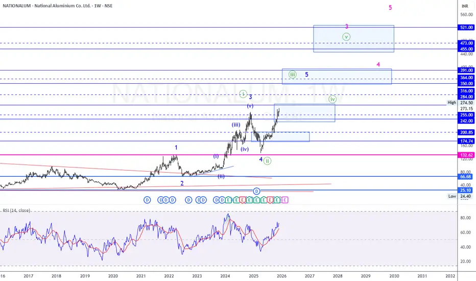 National Aluminium (NATIONALUM) continues to show strong momentum, completing a clean Elliott Wave structure with Wave 5 underway on the weekly chart. The stock has broken out of a multi-year resistance structure and is trending strongly with higher highs and higher lows.