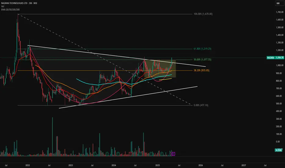 Nazara Technologies has broken out of a multi-year falling wedge on the weekly chart, with a strong green candle above key EMAs and Fibonacci confluence zones. Price closed the week above โน1,100, indicating a shift in long-term momentum and a potential start of a fresh uptrend.